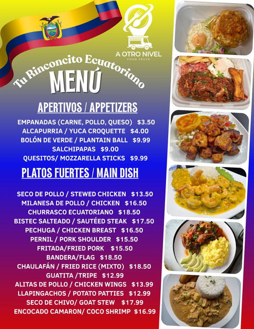 At "A Otro Nivel", we create and serve a unique combination of Ecuadorian and Puerto Rican flavors that will entice your pallet and will allow you to taste our culture's rich flavors. The authentic taste comes from family recipes that are made from fresh, simple, and tasteful ingredients. We welcome you to our Rolling Bites and wish you a hearty appetite.